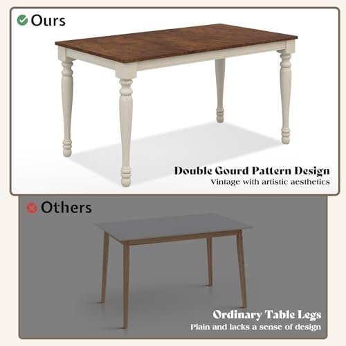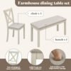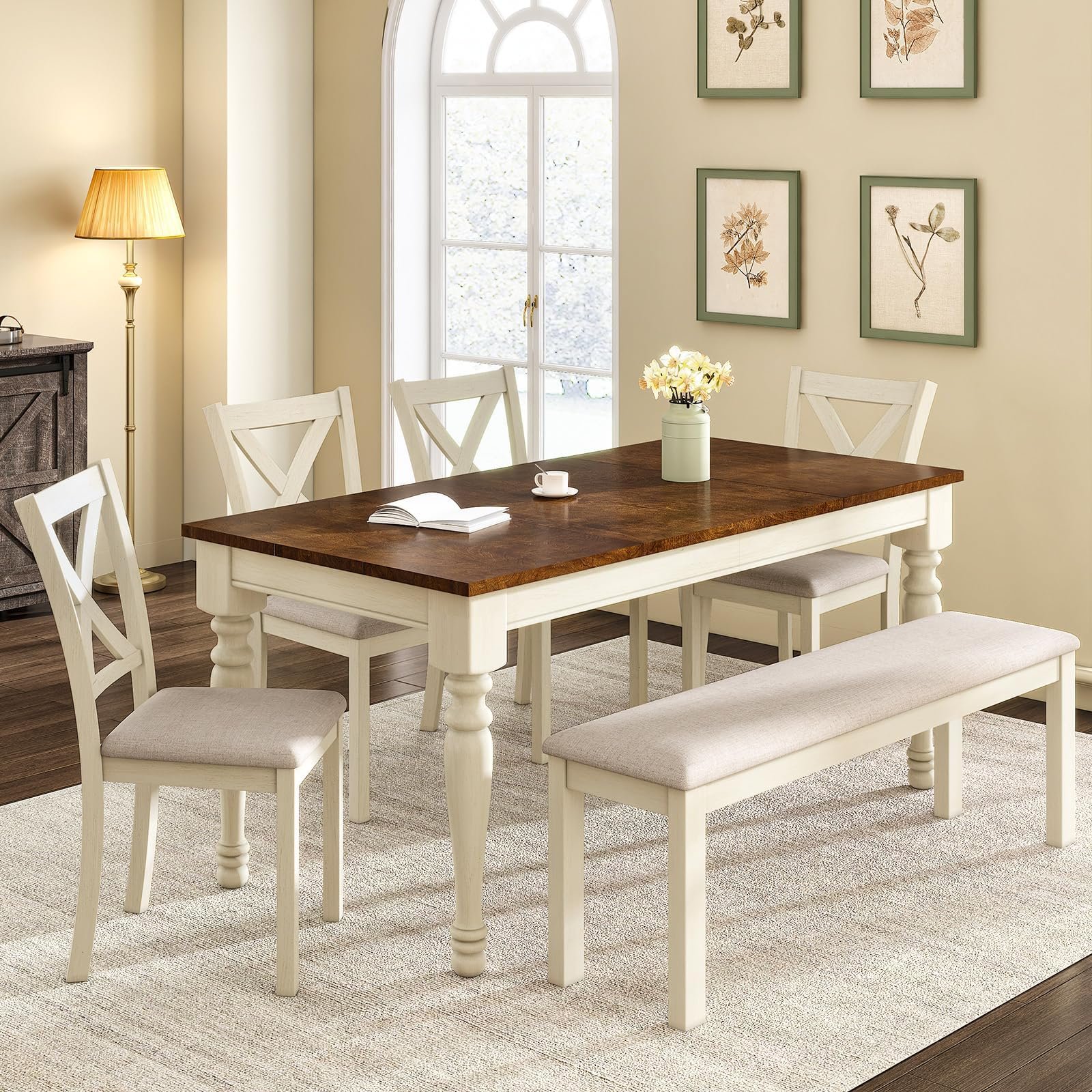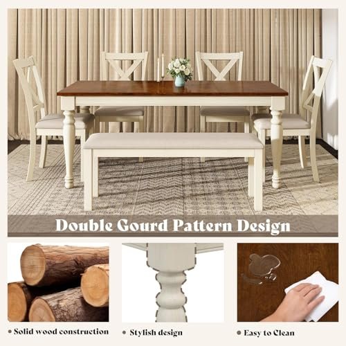 6-Piece Solid Wood Dining Table Set, 71″ Farmhouse Kitchen Table with 4 Upholstered Chairs and Bench, Large Dining Room & Kitchen Furniture Set, Cr…