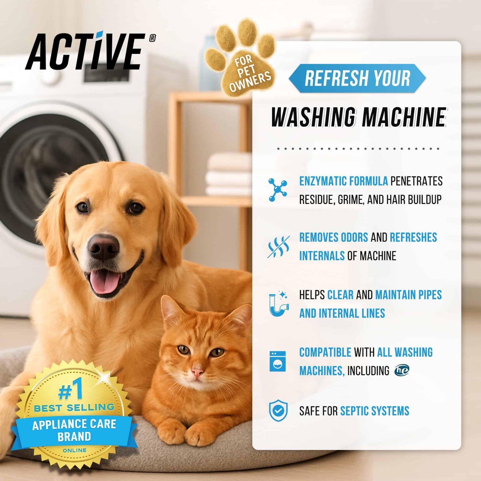 ACTIVE Washing Machine Cleaner for Pet Owners Enzymatic Deep Clean Descaler for Cat & Dog Hair, Urine, Odor, Residue, 24 Septic-Safe Tablets for Top Load, Front Loader, HE Washer Tub – 1 Year Supply