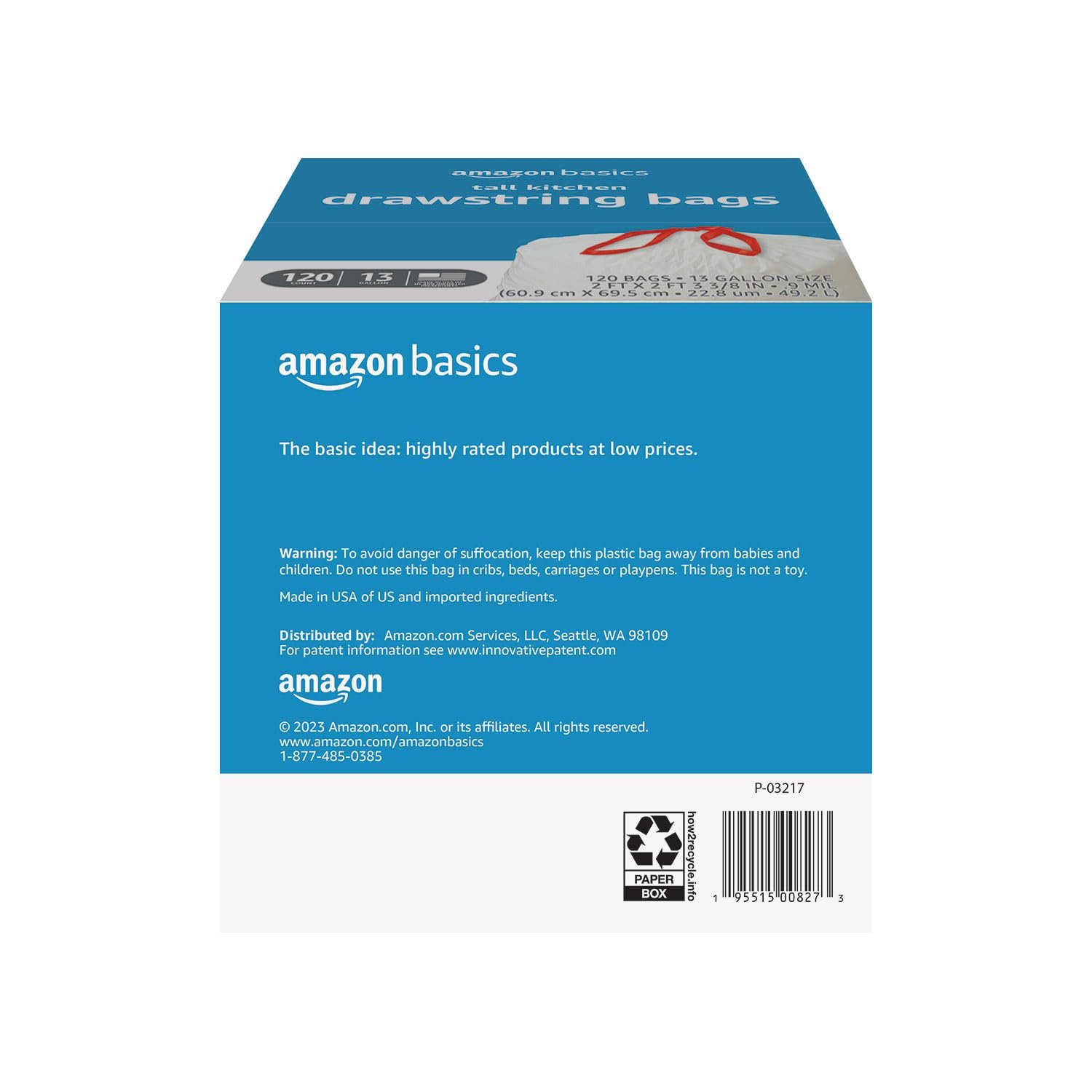 Amazon Basics Tall Kitchen Drawstring Trash Bags, Sturdy and Tear Resistant, 13 Gallon, Unscented, 120 Count