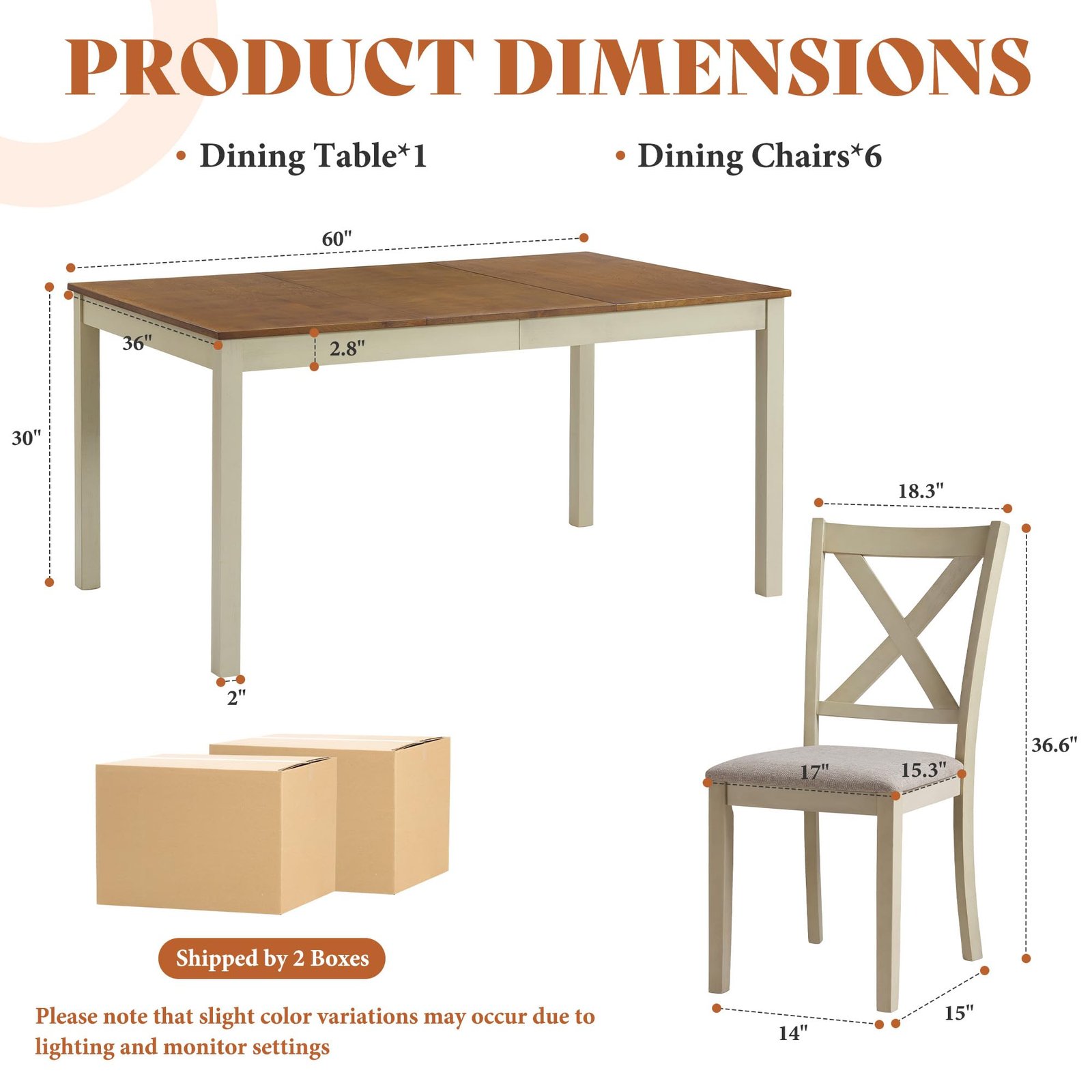 AMERLIFE 7-Piece Farmhouse Solid Wood Dining Table Set with 6 Upholstered Chairs, 60″ Space Saving Dinner Table & Chairs Set, for Dining Room, Kitchen, Restaurant, Rustic Cream