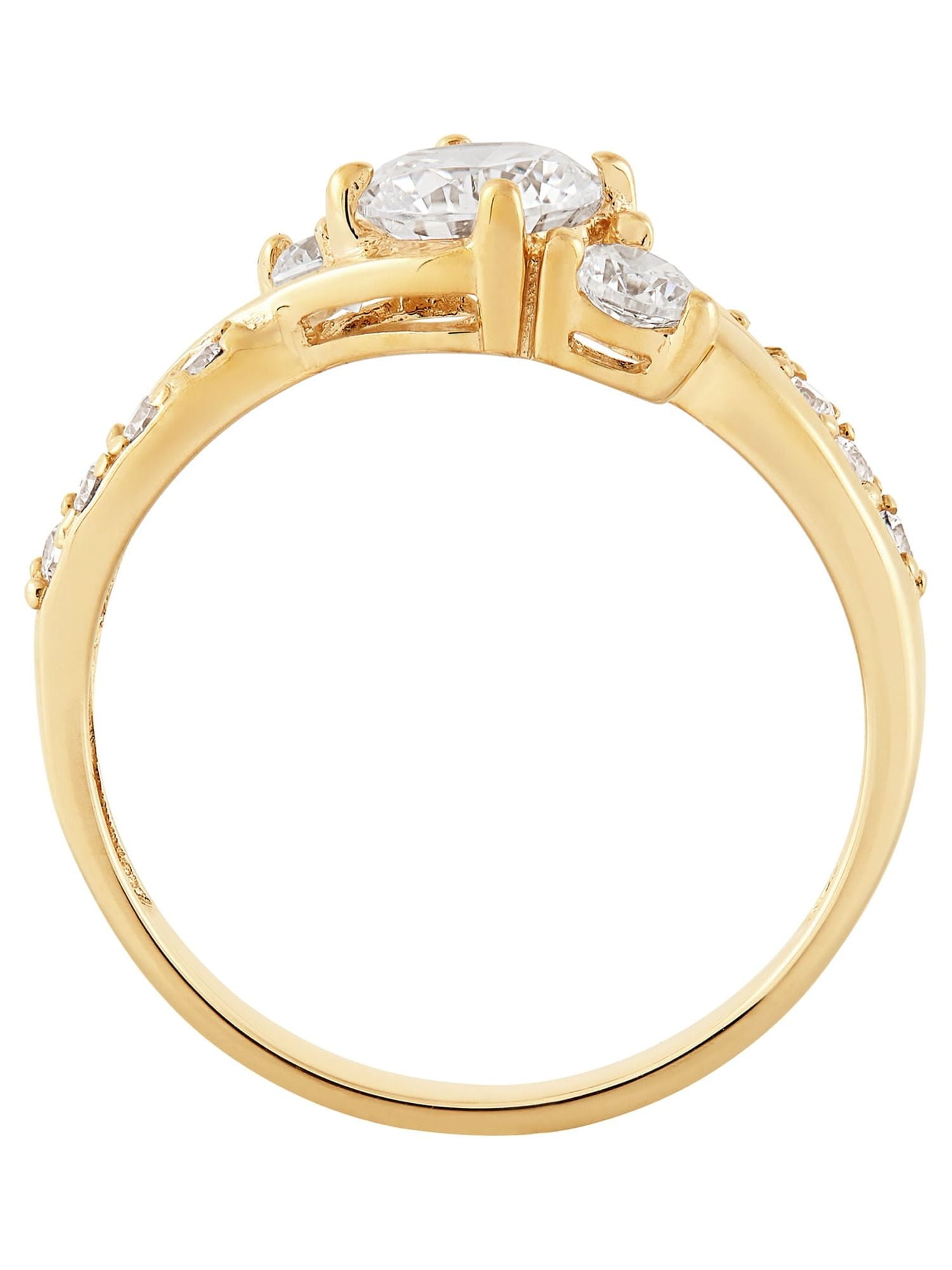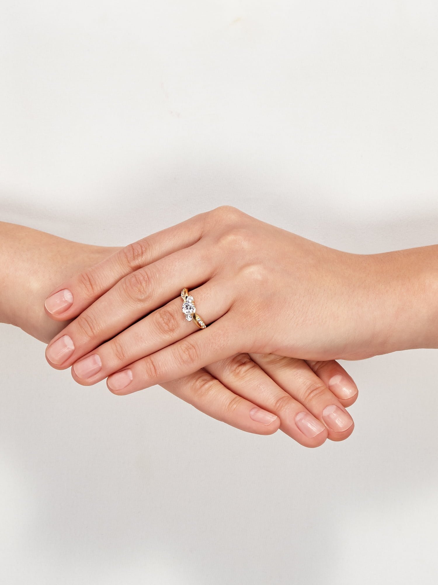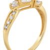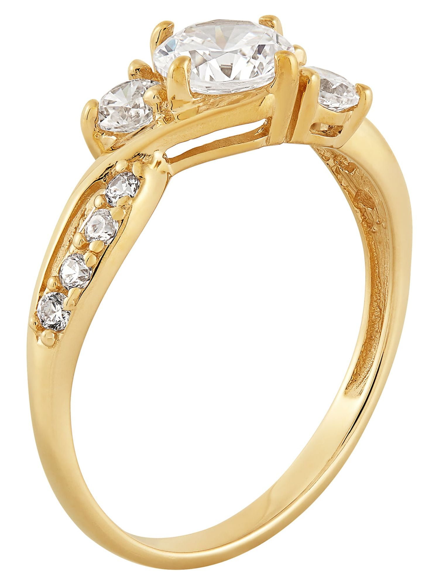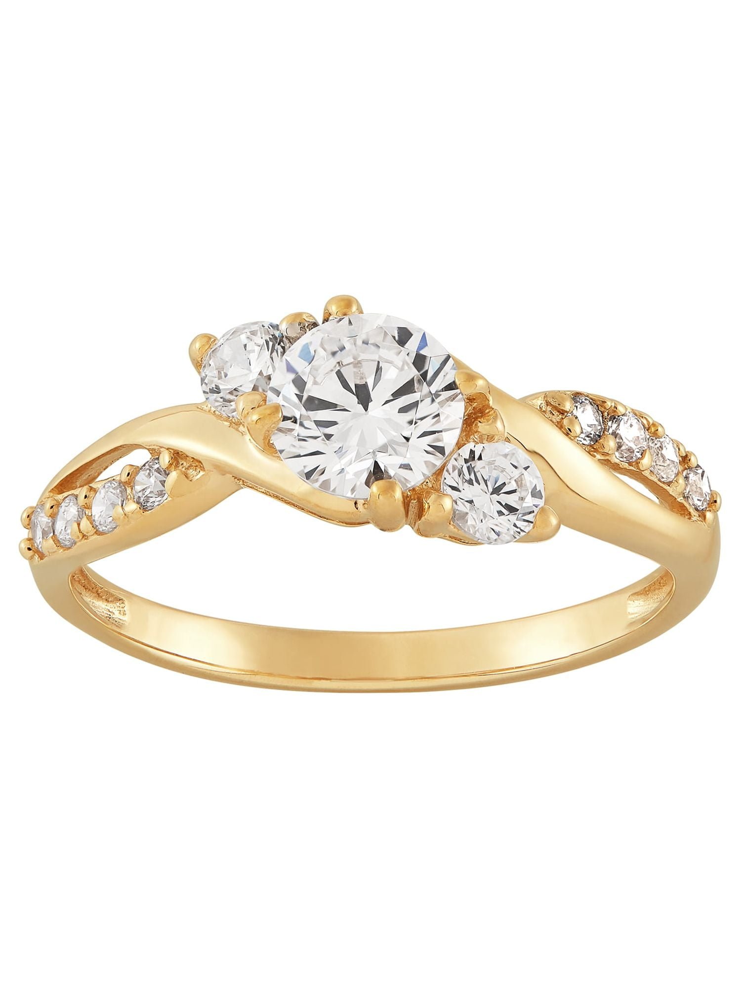 Celebrate that precious moment with this 10K yellow gold three-stone engagement ring featuring a 5.5 mm round center and 3 mm round side stones in the classic prong setting. Round accent white cubic zirconia stones cascading down both sides of the ring add further sparkle. There are a total of eight accent stones in this ring.This ring is created in 10K yellow gold and crafted with a polished finish. This item is a size 7 but it is also available in sizes 6,8 and 9 under item id # 40836946.