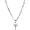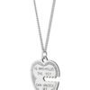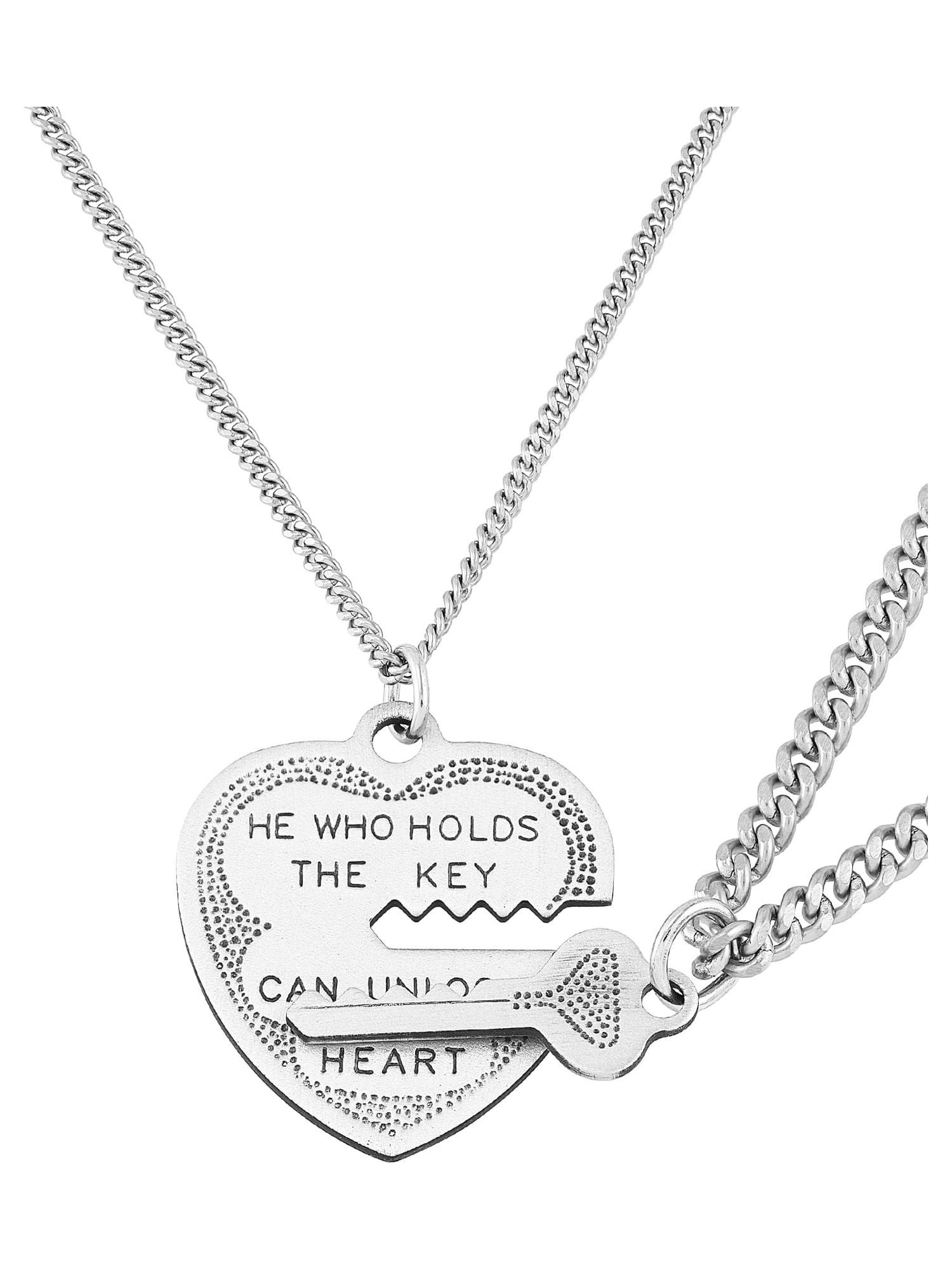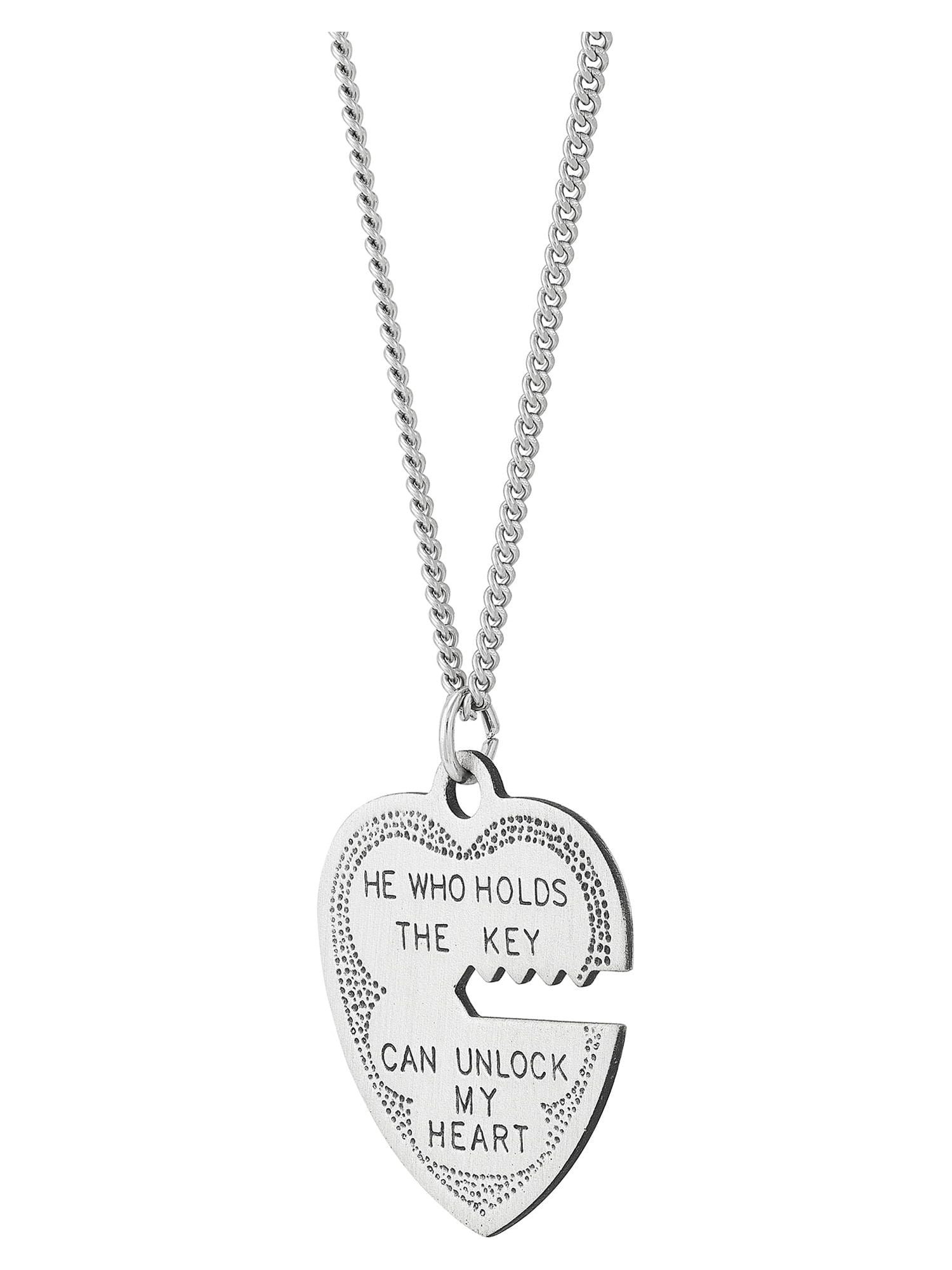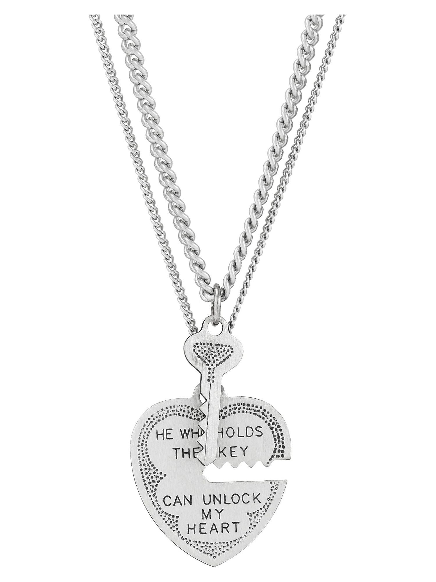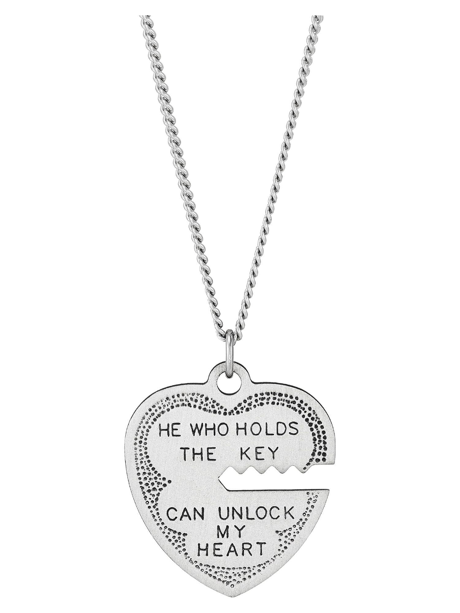 “He who holds the key can unlock my heart” is the heart felt sentiment offered in this duo breakable pendant set. Created in Sterling Silver on Stainless Steel 18 inch curb link chains, the inscribed heart along with its key, are polished as well as slightly textured to create a romantic feel. Both pieces in this set fit perfectly together. The curb chain on the heart is 1.6MM and the chain on the key is 3MM. Both chains have secure spring ring closures. Breakable sets.