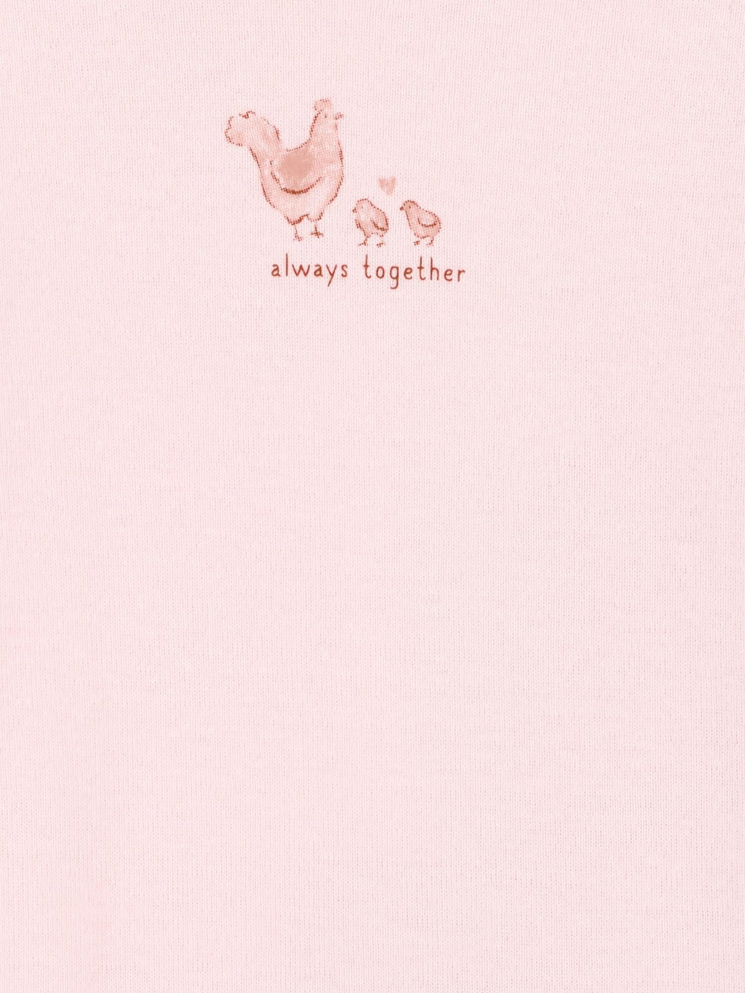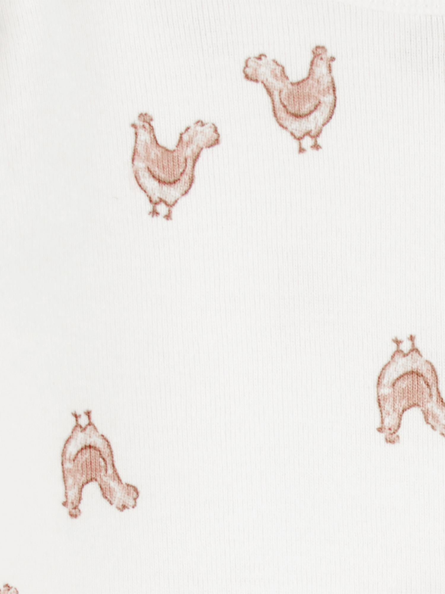 Features: pink chicken prints, overlap shoulders, snaps at legs, long sleeve
