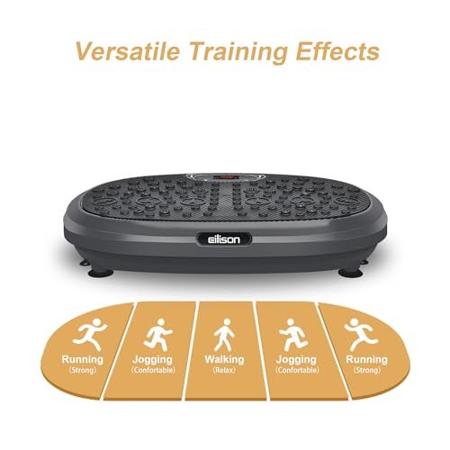 - VIBRATION PLATE WITH UNIQUE ACUPRESSURE SURFACE– Eilison OSCILLATING VIBRATION- 3D whole body vibration plate exercise machine has a unique acupressure plate surface which with the help of strong vibration from our vibration platform machine presses the pressure points on the feet which helps in relieving back pain, headache, insomnia, blood circulation, muscle & joint pain, stress, Anxiety. This workout machines helps you to release blocked energy to maintain healthy life