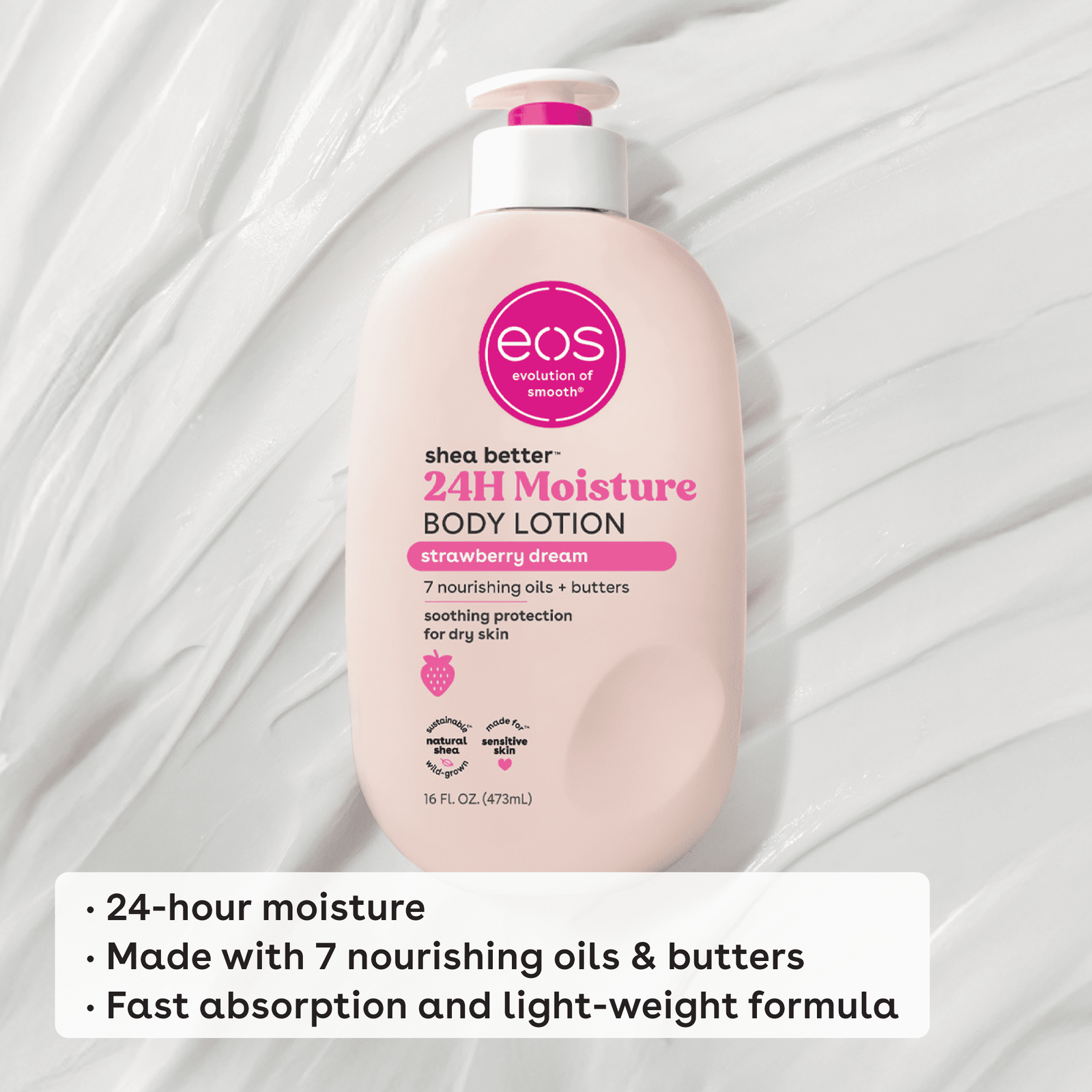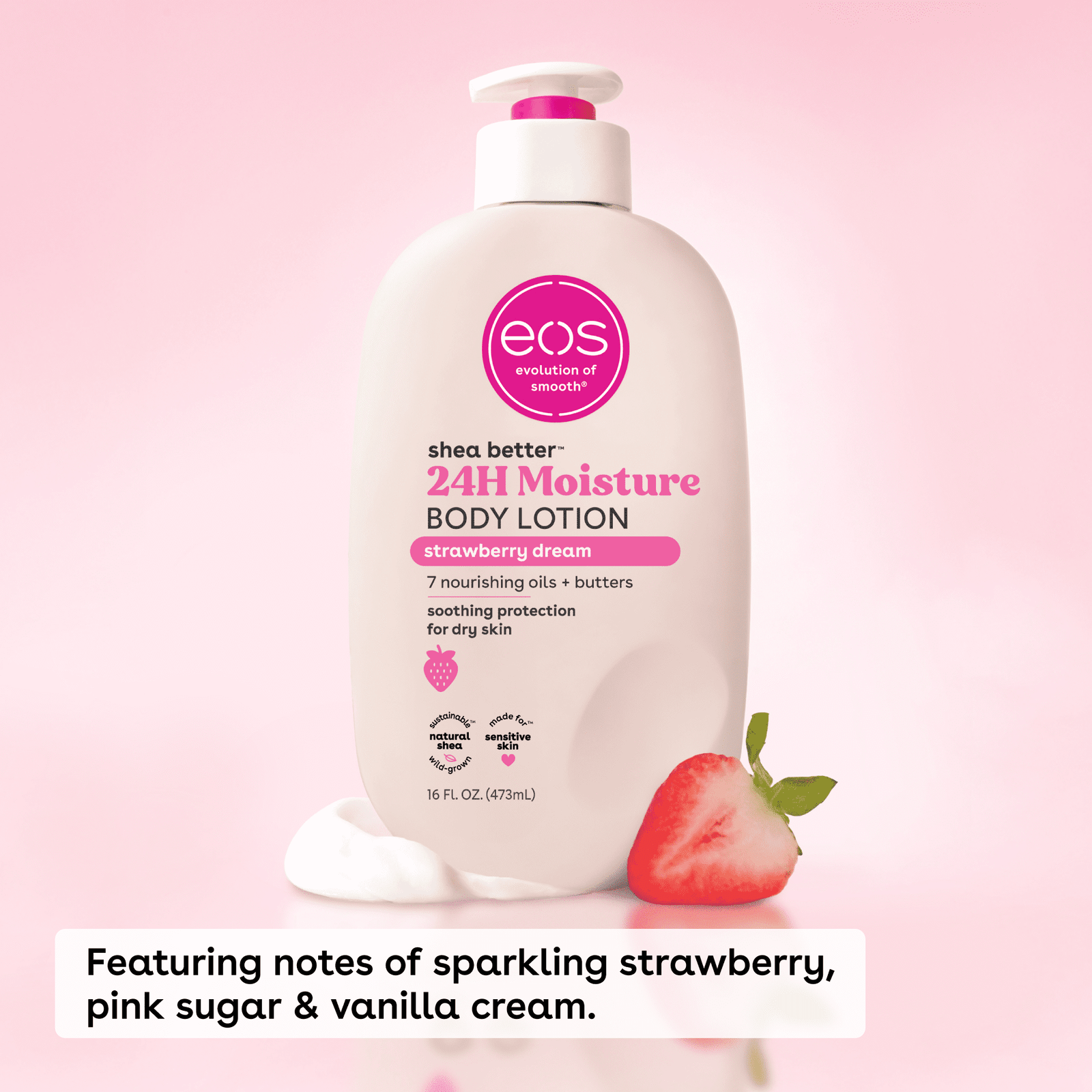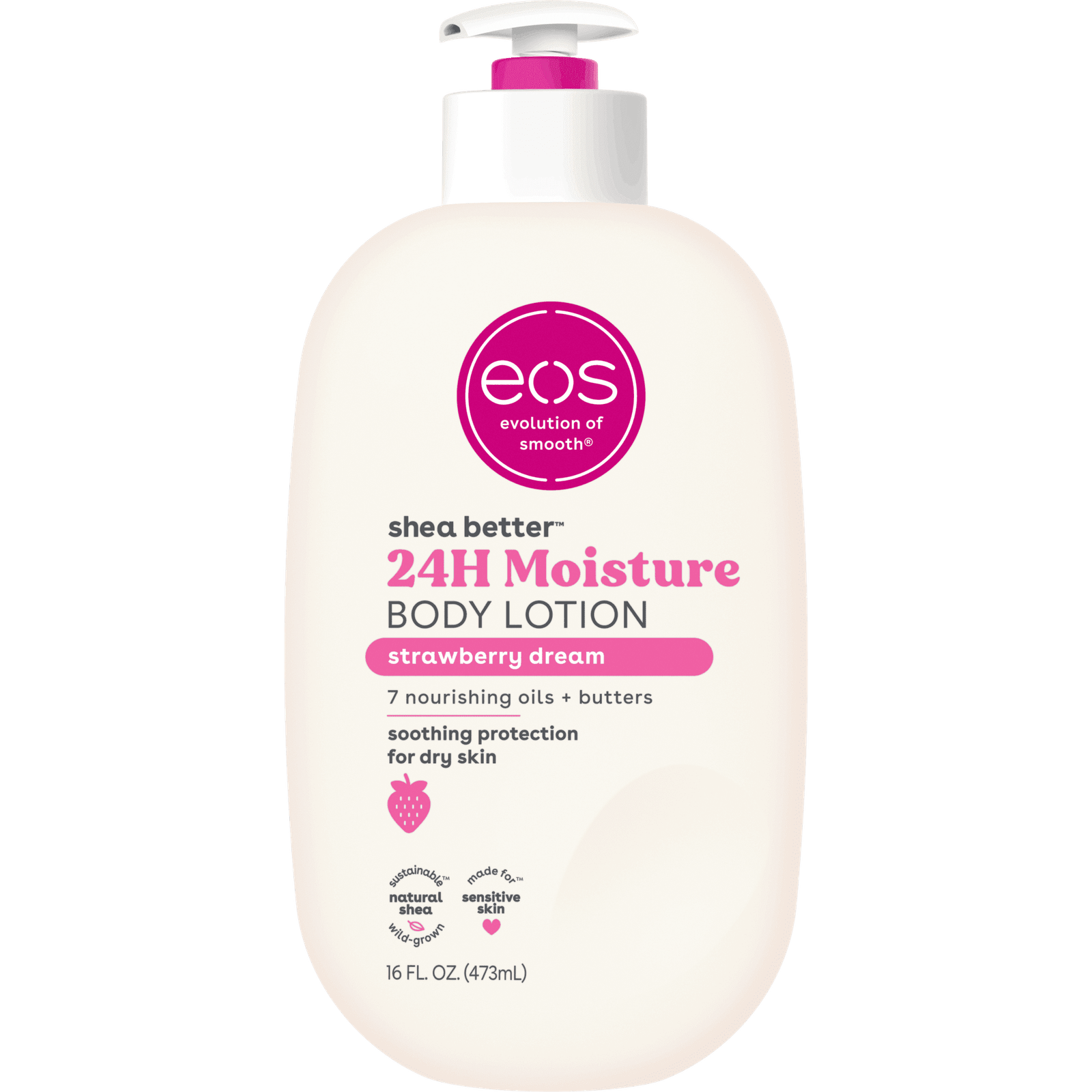 Our playful and delicious Strawberry Dream Body Lotion features notes of sparkling strawberry, pink sugar, and vanilla cream. eos 24H body lotion with instantly moisturizing Shea Oil + lasting protection Shea Butter quickly absorbs for 24-hour hydration. Say hello to… fast-absorption, lightweight, soft skin, and sustainable shea. Say goodbye to… greasiness, heaviness, and sticky residue. Apply this fast-absorbing and deliciously scented body lotion to just-cleaned skin, paying special attention to dry, rough areas. Relax – we’ll do the rest.
