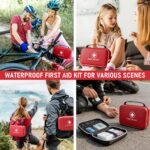 - 【Ultra-Lightweight & Portable】The ultra-light waterproof travel first aid kit is an ideal choice. They won’t weigh you down during hikes and can be easily packed into a backpack or car trunk. Whether you’re camping, picnicking, kayaking, cycling, hiking, or embarking on a long road trip, it serves as a reliable safety companion. Equipped with a carry handle, it can be securely attached to your backpack or placed inside your car, ensuring quick access in emergencies.