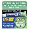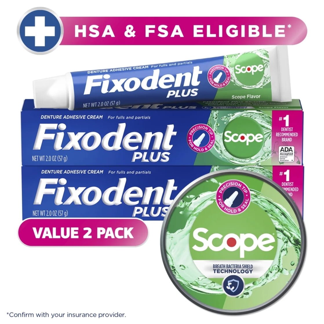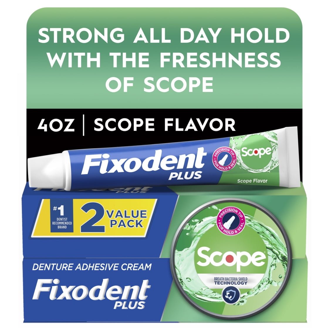 Want fresh breath and a strong denture hold? Try Fixodent Plus Scope Denture Adhesive Cream, Scope Flavored, 2 oz, 2-pack. This secure denture adhesive combines a great hold with fresh breath by killing germs that cause bad breath. Whether you’re searching for denture adhesive, denture glue, or dental adhesive, Fixodent Plus Scope delivers reliable performance. The Precision Tip Nozzle gives you the control to apply the right amount of Fixodent Denture Cream just where you want it. This false teeth dental adhesive helps keep food particles from getting between dentures and gums, ensuring a strong, comfortable hold. Fixodent Plus Scope Denture Adhesive Cream leaves breath fresh with Plus Scope Flavor and is formulated with Breath Bacteria Shield Technology. Comes in a recyclable carton. ADA accepted. Experience life, not dentures.