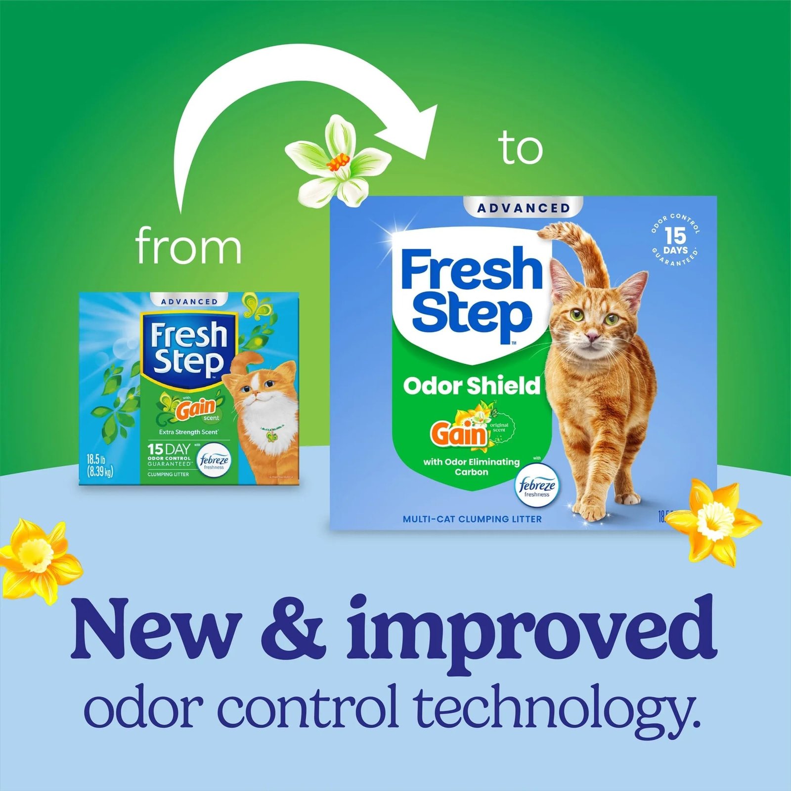 - FRESH STEP CLUMPING CAT LITTER: Two 18.5-lb. boxes of Fresh Step Advanced Clumping Litter with Febreze freshness with Febreze Gain scent to keep litter boxes smelling fresh