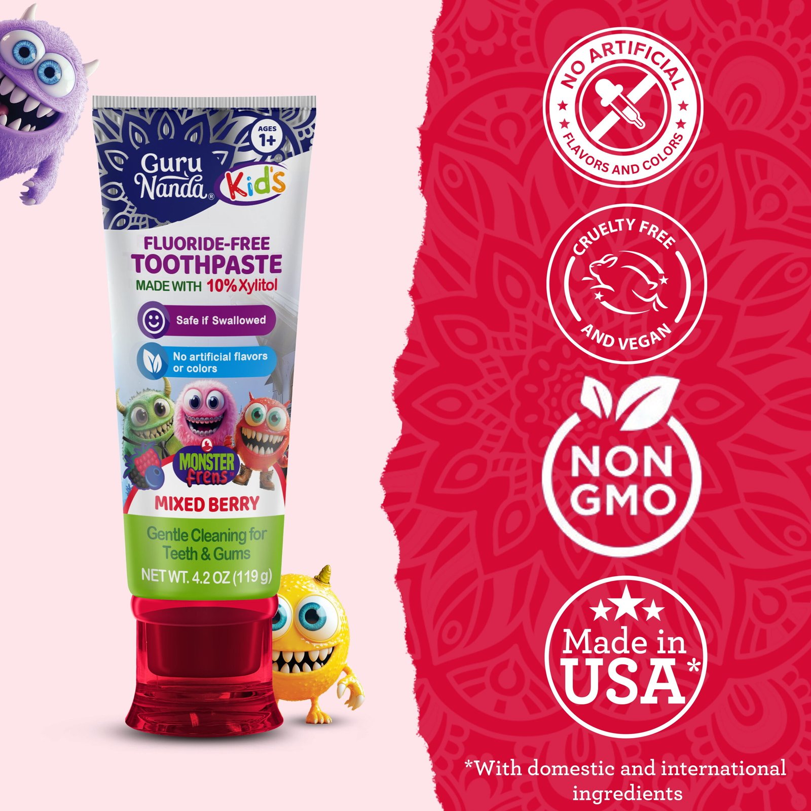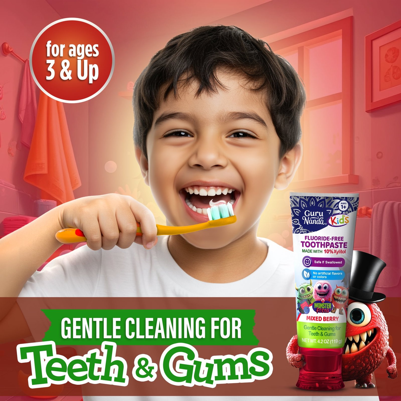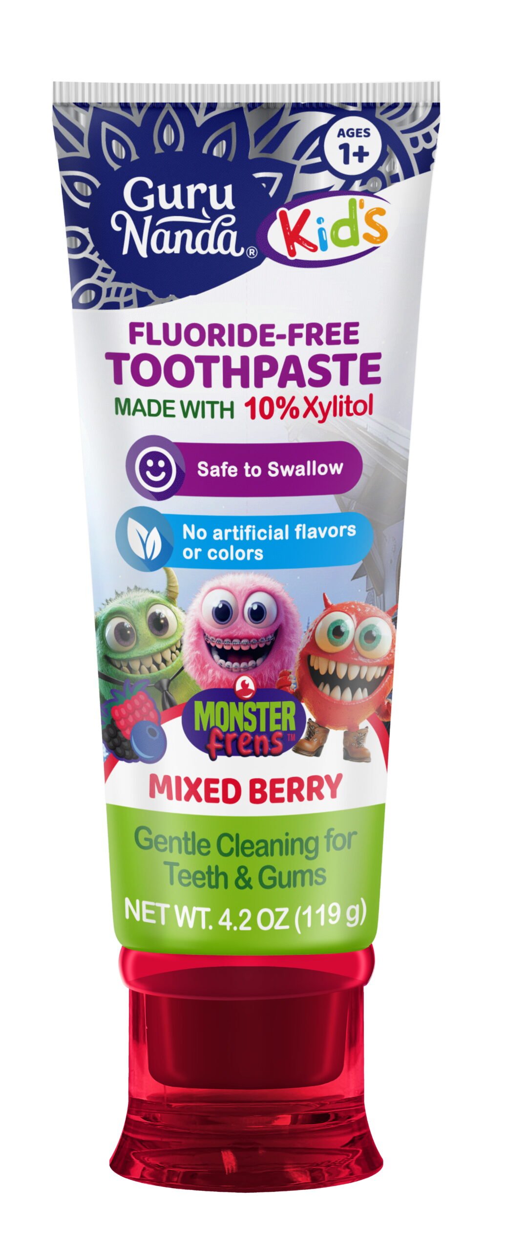 Make brushing fun and safe for your little ones with our GuruNanda Mixed Berries Kids Toddler Toothpaste! Packed with a delicious mixed berries flavor, it turns brushing time into a delightful experience. Designed with a gentle, non-abrasive formula, it’s perfect for young teeth and sensitive gums. Our fluoride-free toothpaste ensures safety for toddlers and kids still mastering the art of spitting, while natural, non-toxic ingredients offer parents peace of mind. It effectively cleans teeth, supports oral health, and is free from sodium lauryl sulfate (SLS) to minimize irritation. We’ve skipped artificial flavors, colors, and preservatives, creating a pure, safe product your kids will love. The toothpaste tube is also designed with little hands in mind, making it easy for your child to develop healthy brushing habits. Choose a toothpaste that’s as gentle, safe, and effective as it is fun!