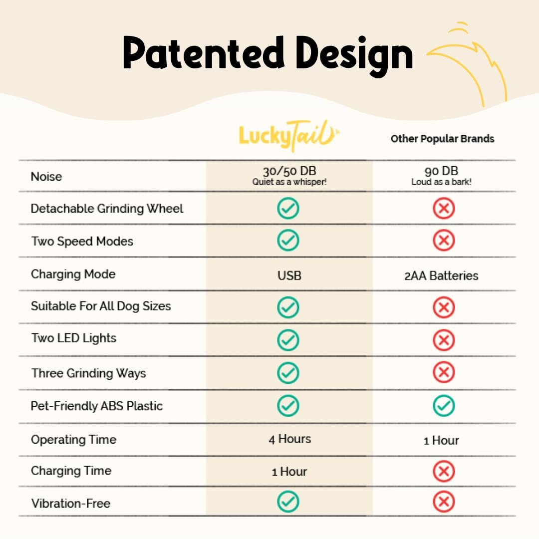 “Say goodbye to loud nail trimming! Our LuckyTail Pet Nail Grinder is super quiet, low-vibration, and rechargeable via USB, making grooming a breeze for you and your pet.”