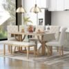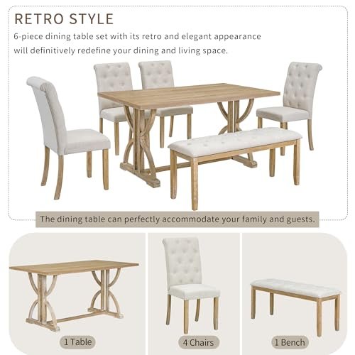 Merax 6-Piece Solid Wood Kitchen Dining Room Table Set with Bench and Upholstered Chairs for 6 Persons, Dining Table Set with with Rectangulars Table and Upholstered Seat, Natural Wood Wash