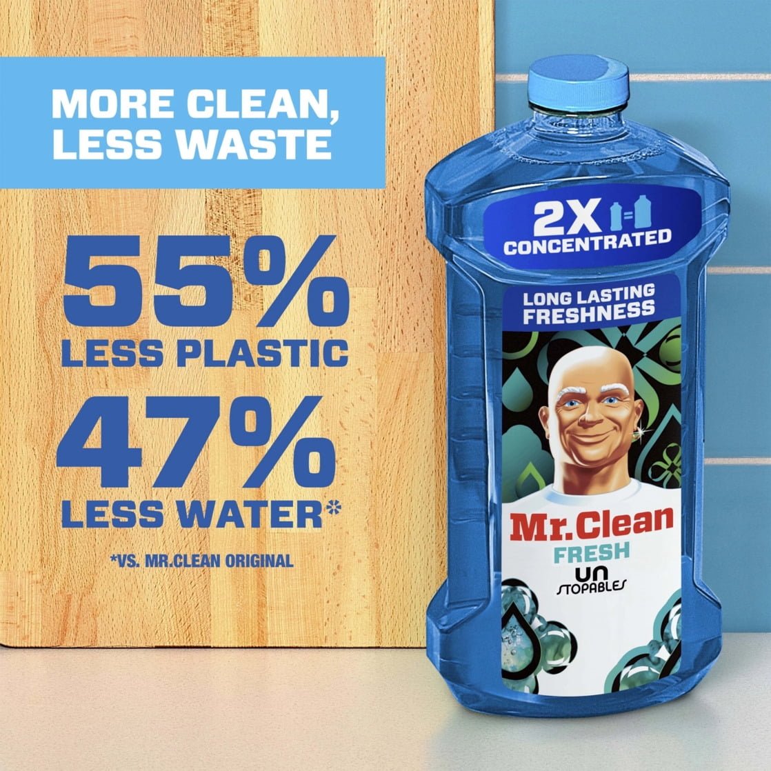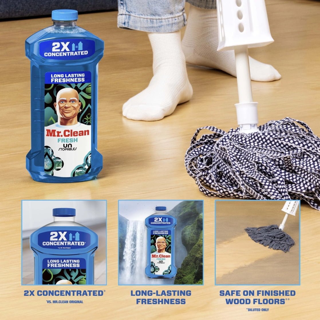 Mr. Clean’s 2X Concentrated Multi Surface, All Purpose Cleaner muscles through 100% of dirt and grease for powerful, multi-surface cleaning. This floor cleaner for mopping is great for cleaning linoleum, tile & hardwood floors**. Use Mr. Clean’s 2X Concentrated Multi Surface, All Purpose Cleaner as a bathroom cleaner to clean toilets, sinks, and bathtubs. This multi-surface cleaner even works outside on garbage cans, doors, and more. It makes cleaning your house that much easier and leaves the long-lasting freshness of Unstopables Fresh scent behind. Add Mr. Clean’s 2X Concentrated Multi Surface, All Purpose Cleaner to your arsenal of cleaning supplies today! *vs. Mr. Clean Original **use diluted only. This product is a great addition to your cleaning supplies, ensuring effective and efficient cleaning.
