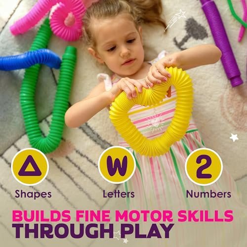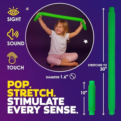 - 😃 FUN STEM TOY FOR KIDS – bright coloured pop tubes are EASY TO CONNECT giving your little ones freedom to explore designs and applications of their own; teach the kids LETTERS and SHAPES with this educational stem toy and get children to improve their motor skills or simply let them fidget on a car ride; STRESS RELIEF FOR ADULTS – no joke, give an adult a pop tube and transform him into a child who won’t let his new toy down and keep popping it and making noise.