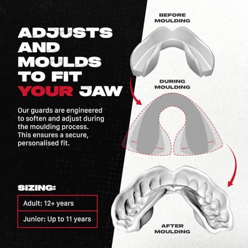 - JAW PROTECTION – We have a unique pre-formed base to our mouthguards that we like to call JawSecure. This helps protect your jaw from injury, cushioning the teeth from any impact taken whilst biting down on the guard. Suitable for all contact sports.