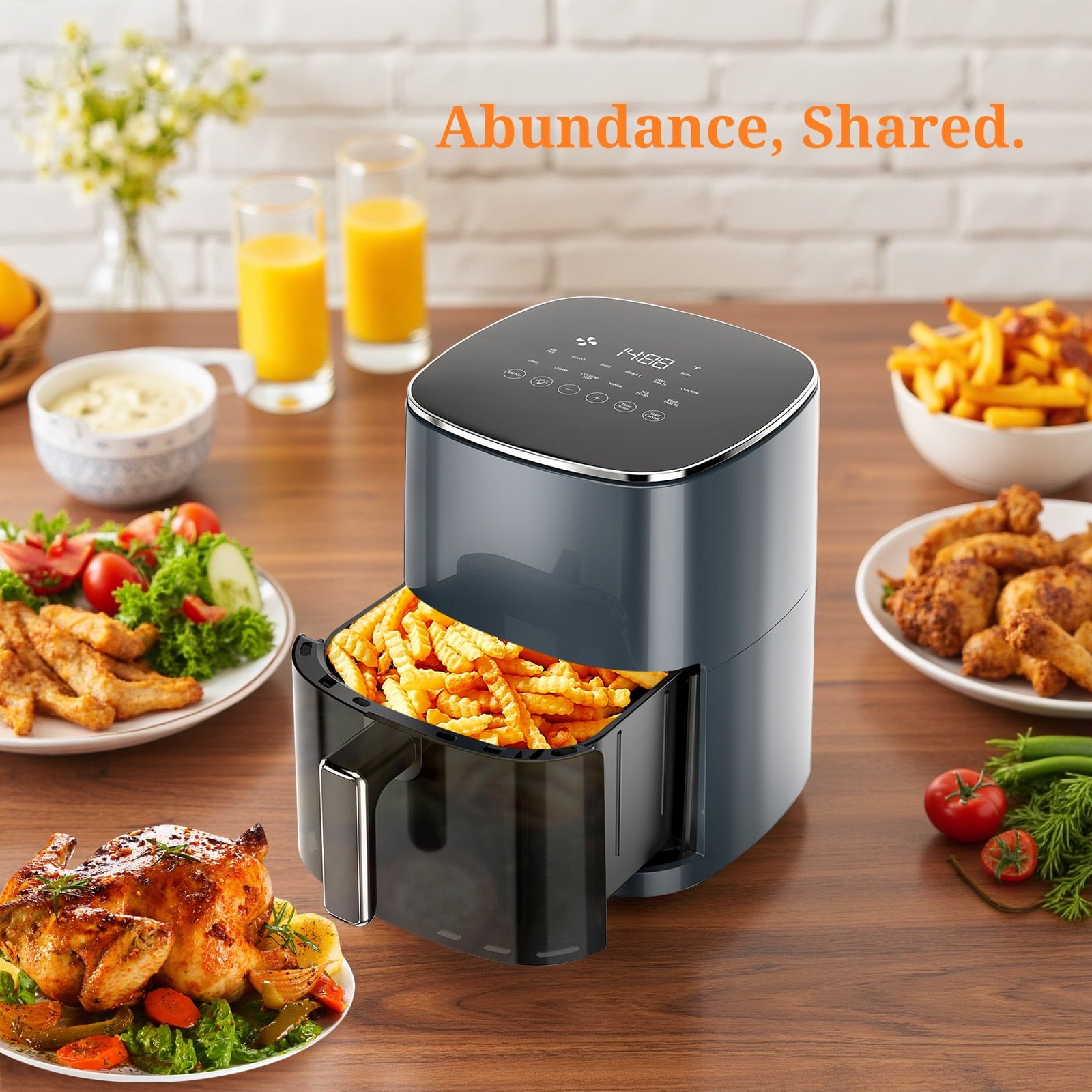 【12-in-1 Versatile Cooking Modes】Master every meal with 12 smart functions including Air Fry, Roast, Bake, Broil, and Dehydrate – delivering perfect results from crispy fries to juicy meats and homemade snacks with just one tap.