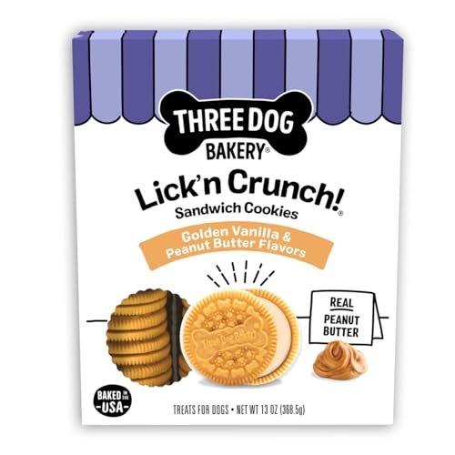 Three Dog Bakery Lick’n Crunch! Golden & Peanut Butter Dog Sandwich Cookies – Crunchy Vanilla & Creamy Peanut Butter Flavored Dog Treats, Cookies for Dogs, Dog Birthday Cookies, Dog Training Treats