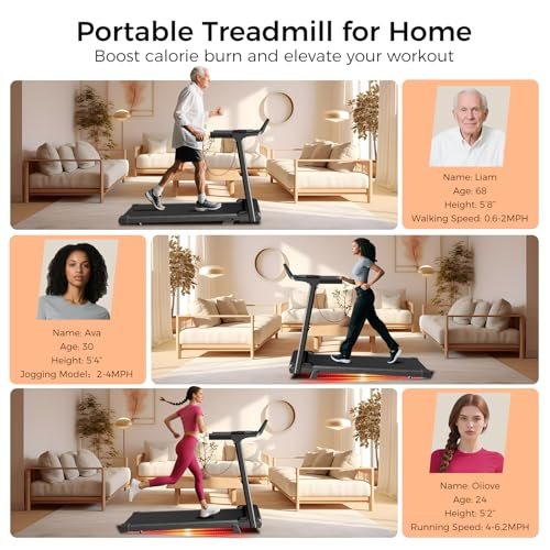 - 【 Easy Move and Store】The compact design of this treadmill for home makes it easy to store and easy to store in small spaces such as home or apartments. The treadmills for home built-in wheels allow it to be moved effortlessly under a bed or sofa for storage,this mini treadmill weighs only 48 Pound,the running belt measures 39 inches in length and 15 inches in width, providing ample space for walking or running on this incline treadmill.