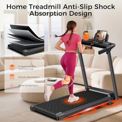 - 【Shock-Absorbing Running Belt Protected Joints】This treadmill with handle comes with a durable six-layer running belt, which is designed to increase shock absorption non-slip performance and prolong service life.,It is also equipped with 4 high-density silicone shock absorbers and 2 impact-reduction pads and anti-slip handle, while padded grips and shock-absorption tech work together to reduce knee stress by 40%.Treadmill is designed to accommodate users of most body types.