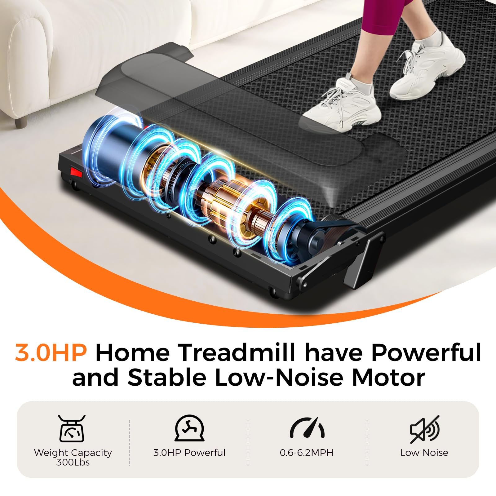 - 【Quiet Brushless Motor】The walking pad treadmills featuring a sturdier steel frame construction, has undergone rigorous testing,continuous 8-hour operation tests. Ensures a stable and durable product,The treadmill is equipped with a brushless motor with a maximum power of 3.0HP and can withstand users up to 300 lbs. this portable treadmill runs smoothly at speeds of 0.6-6.2 MPH,The internal noise reduction layer effectively controls the noise level at 55 dB,Provide a smoother sports experience.
