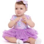 Bodysuit Features: Crewneck; snap buttons at back and bottom; short sleeves with lettuce edges; ribbed knit; allover print; layered mesh tulle tutu skirt; classic fit